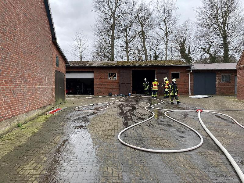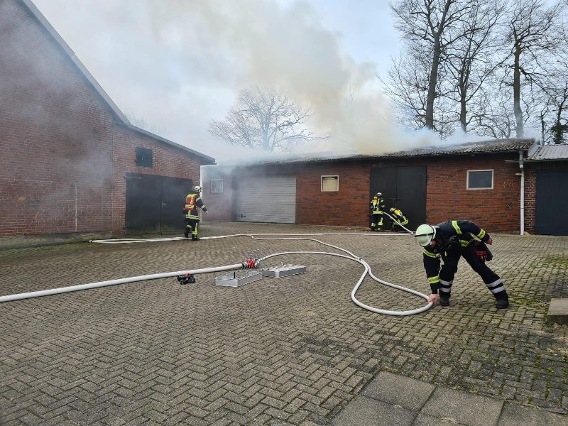Heute Vormittag wurden wir zu einem Brand in die Hamburger Str. gerufen. Das erste Alarmstichwort hieß F2 Feuer in einem landwirtschaftlichen Gebäude. Aufgrund der vielen Anrufer, die von kleinen Explosionen berichteten, wurde der Alarm schnell auf F3 erhöht. Beim Eintreffen war die Rauchentwicklung schnell erkennbar und die Brandbekämpfung wurde eingeleitet,zusammen mit den Kameraden aus Leversen und später mit Iddensen, Nenndorf und Beckedorf-Metzendorf. Von den drei Gebäuden, war das mittlere betroffen und erste Flammen stiegen aus dem Dach. Das Tor war verschlossen und so begann die Brandbekämpfung durch die vorderen und hinteren Fenster. Um Zugang zu erlangen, wurde das Tor mit einer Rettungssäge aufgeschnitten. Die Löscharbeiten zeigten schnell Wirkung, so dass beim Betreten nur noch Nachlöscharbeiten nötig waren. Mit Hilfe der Wärmebildkamera wurden gezielt die restlichen Glutnester gelöscht. Durch das Verbrennen der gelagerten Betriebsstoffe und des Eternitdaches entstand eine hohe Kontermination der Einsatzmittel, die aufwendig gereinigt und getauscht werden mussten. Zwei Kameraden erlitten leichte Verletzungen und wurden durch den Rettungsdienst versorgt.