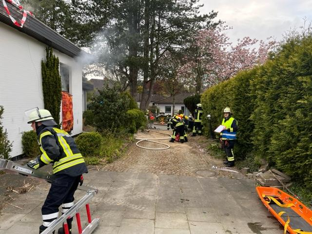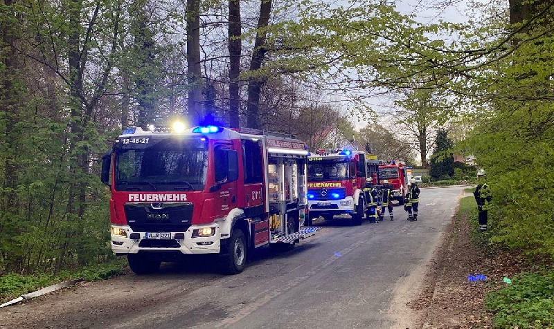 Schließlich konnten die 3 Personen aus dem Gebäude gerettet werden und an den inzwischen eingetroffenen Rettungsdienst übergeben werden, der dann die weitere Behandlung übernahm. Unterstützt wurde der RD hier durch „Helfer vor Ort“-Kräfte aus der FF Vahrendorf. Bei den Rettungsdienstkräften handelte es sich um Auszubildende des DRK die mit 2 RTW und einem NEF an der Alarmübung teilnahmen.