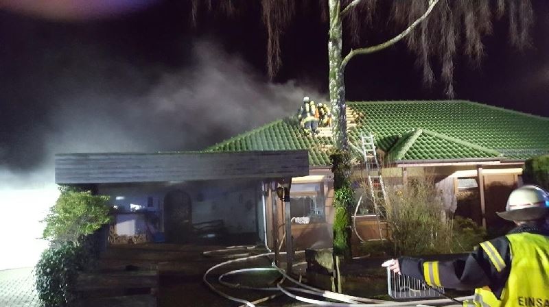 Schnell stellte sich der Erfolg ein. Zum Ablöschen des Feuers musste die Dachkonstruktion geöffnet werden und mit Motorsägen Zwischenräume geöffnet werden. So konnte auch ein Übergreifen des Brandes auf das gesamte Wohnhaus verhindert werden.