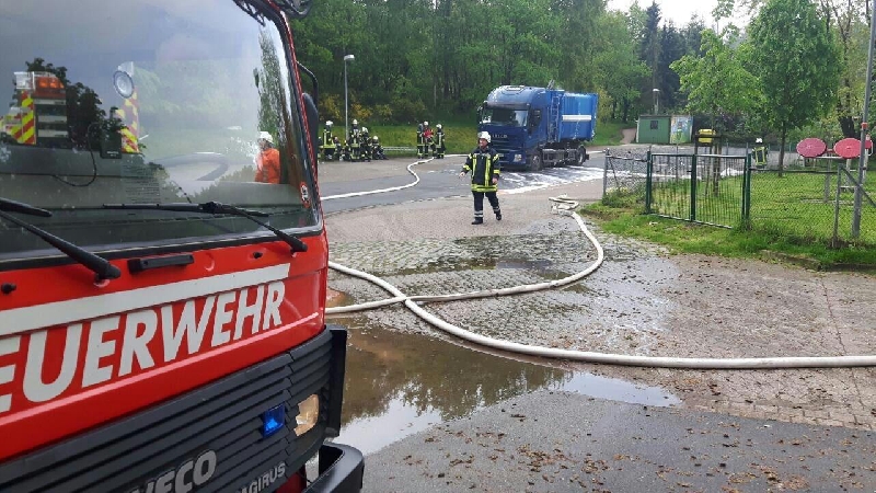 Zur ersten Brandeindämmung nahmen zwei Kameraden unter Atemschutz ein Schaumrohr über eine Leiter vor. Parallel wurden alle umliegenden Gullies gegen kontaminiertes Löschwasser abgedichtet. Zwischenzeitlich konnte der Wohnort des Fahrers ermittelt und durch die Besatzung eines Mannschaftstransportwagens zur Einsatzstelle befördert werden.