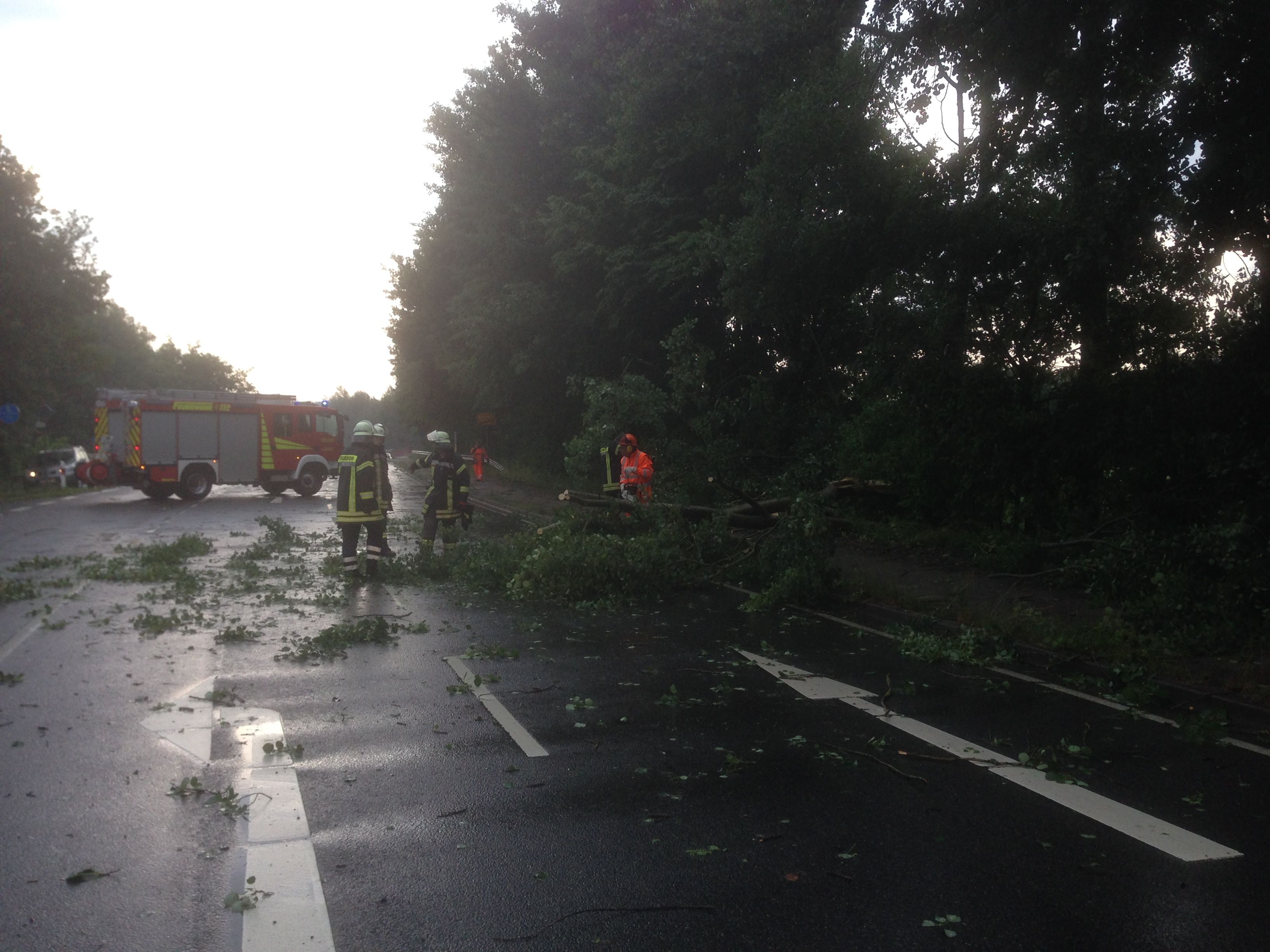 Zu einer technischen Hilfeleistung wurden am Donnerstag im Zuge des Unwetters um 12:10h mit dem Stichwort „Baum auf Straße die Feuerwehren aus Tötensen und Leversen-Sieversen durch die Rechnungsleistelle des Landkreises Harburg in Winsen alarmiert. Auf der Straße "Westerhofer Str." in Westerhof war durch das Unwetter ein Baum umgekippt. Ein Fahrzeug der BGS hatte bereits angefangen den Baum zu zersägen. Die Feuerwehr Tötensen war für 20 Minuten mit 9 Kameraden im Einsatz. Insgesamt waren 14 Einsatzkräfte eingesetzt.