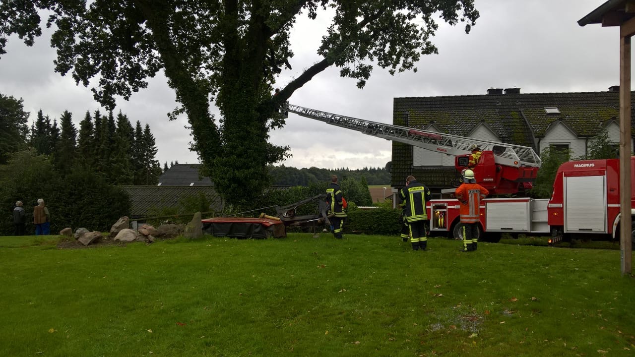 Hier drohte ein Teil einer großen Eiche auf ein Haus zustürzen. Mit der Hilfe einer Kettensäge und der Drehleiter der Feuerwehr aus Meckelfeld wurde die Gefahr beseitigt. Insgesamt war die Feuerwehr mit acht Kameraden aus Tötensen und Meckelfeld für 3,5 Stunden im Einsatz.